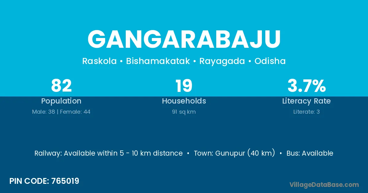Gunupur (40 km) is the nearest town to Gangarabaju village for major economic activities and is located approximately 40 km away.