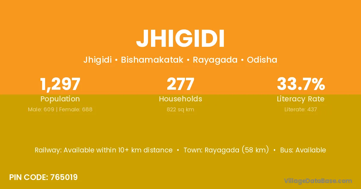 Rayagada (58 km) is the nearest town to Jhigidi village for major economic activities and is located approximately 58 km away.