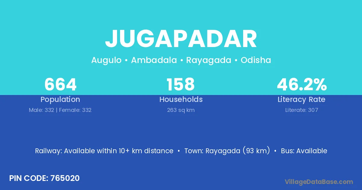 Rayagada (47 km) is the nearest town to Jugapadar village for major economic activities and is located approximately 47 km away.