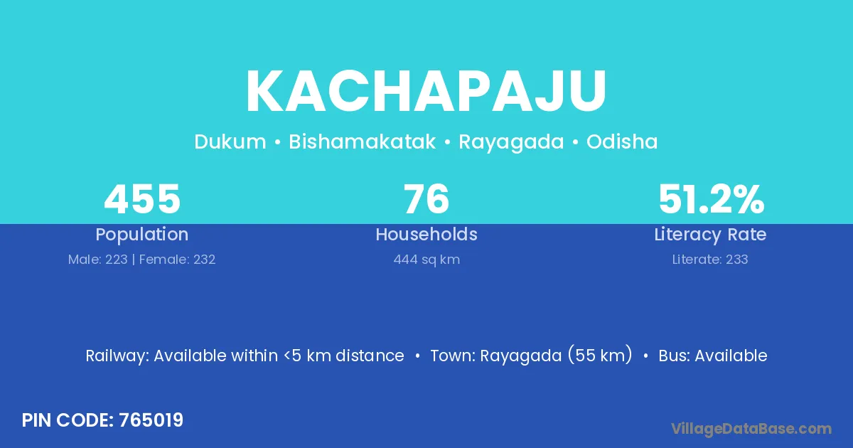 Rayagada (55 km) is the nearest town to Kachapaju village for major economic activities and is located approximately 55 km away.