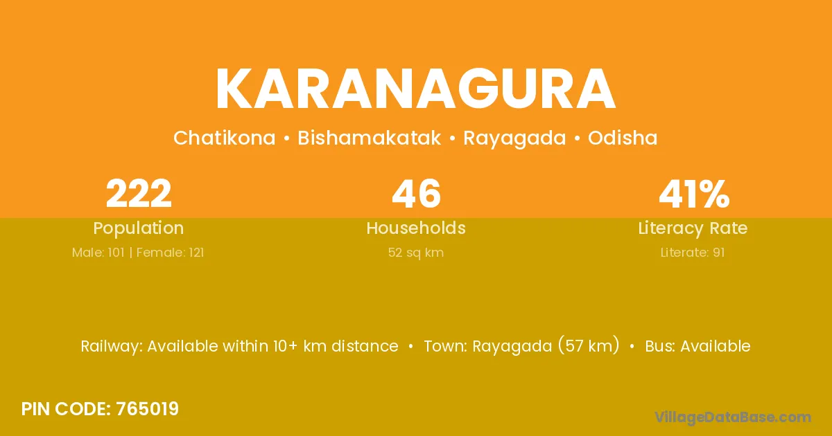 Rayagada (57 km) is the nearest town to Karanagura village for major economic activities and is located approximately 57 km away.