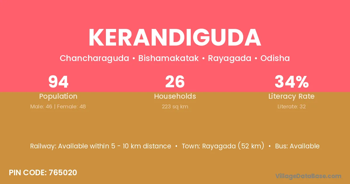 Kerandiguda village has a total population of 94 people, of which 46 are males and 48 are females.
