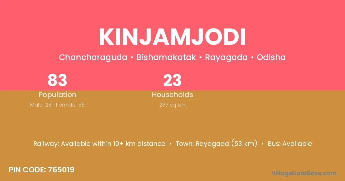Rayagada (53 km) is the nearest town to Kinjamjodi village for major economic activities and is located approximately 53 km away.