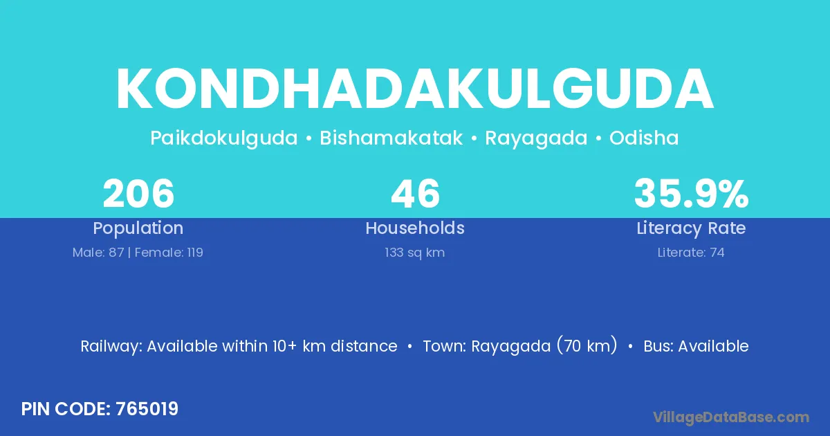 Rayagada (70 km) is the nearest town to Kondhadakulguda village for major economic activities and is located approximately 70 km away.
