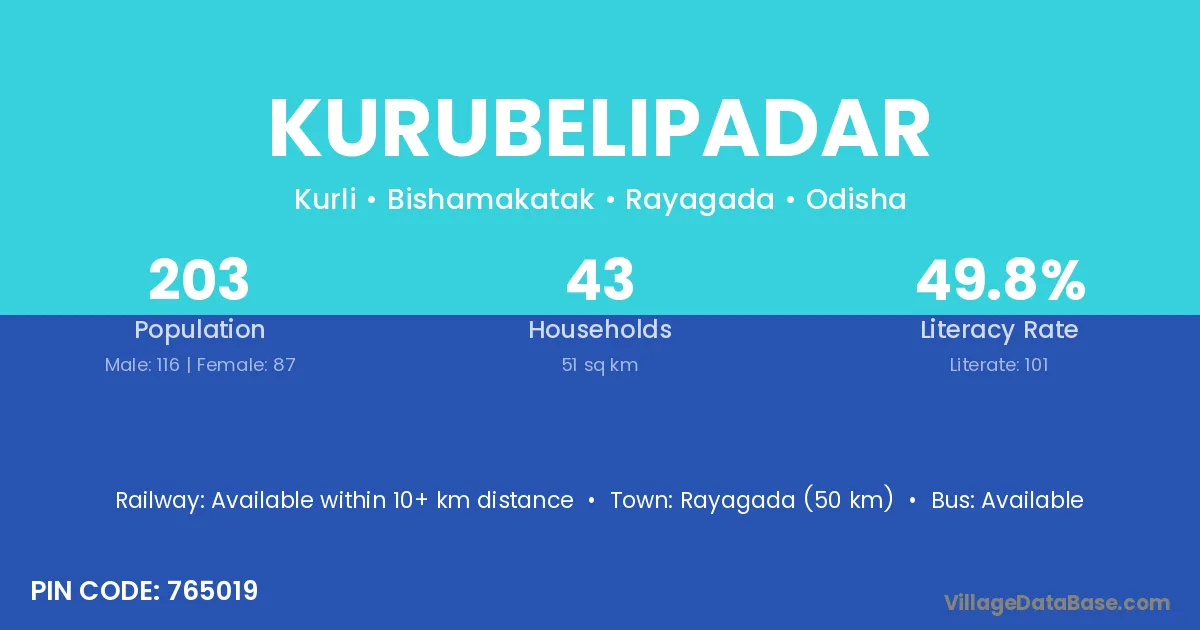 Rayagada (50 km) is the nearest town to Kurubelipadar village for major economic activities and is located approximately 50 km away.
