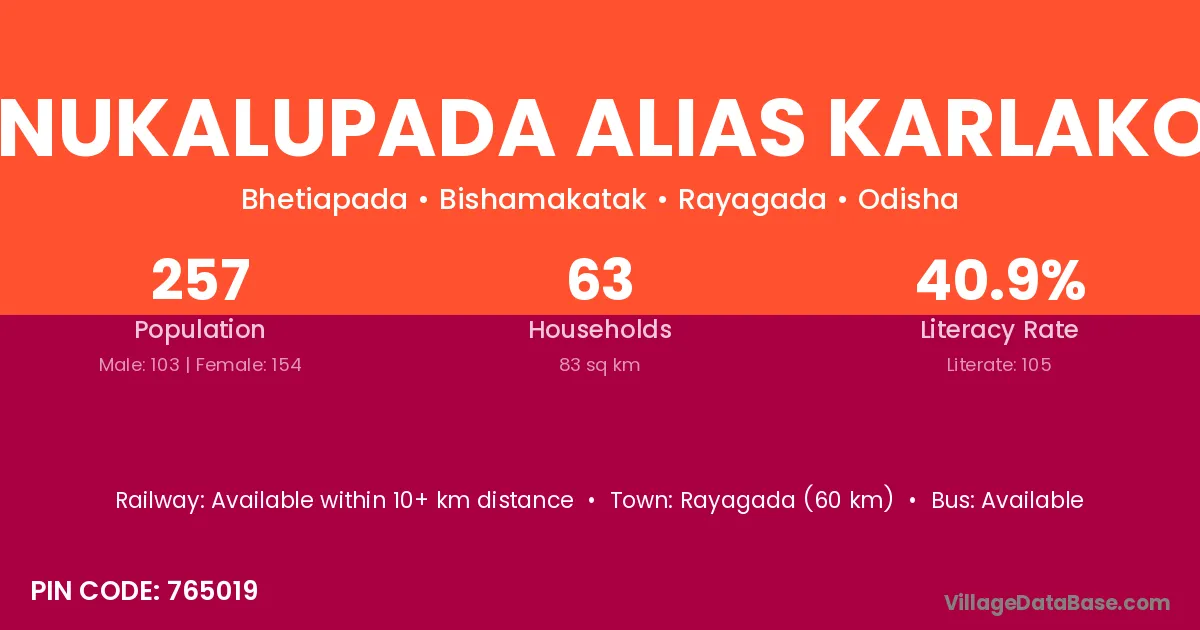 Rayagada (60 km) is the nearest town to Munukalupada Alias Karlakona village for major economic activities and is located approximately 60 km away.
