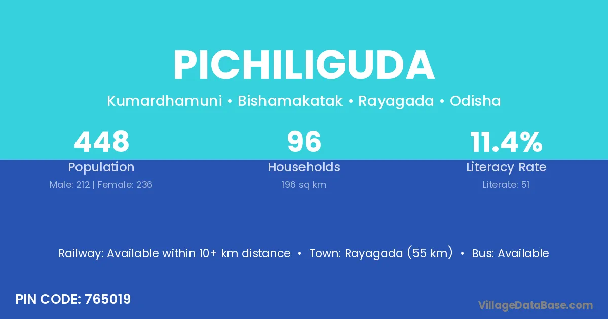 Rayagada (55 km) is the nearest town to Pichiliguda village for major economic activities and is located approximately 55 km away.