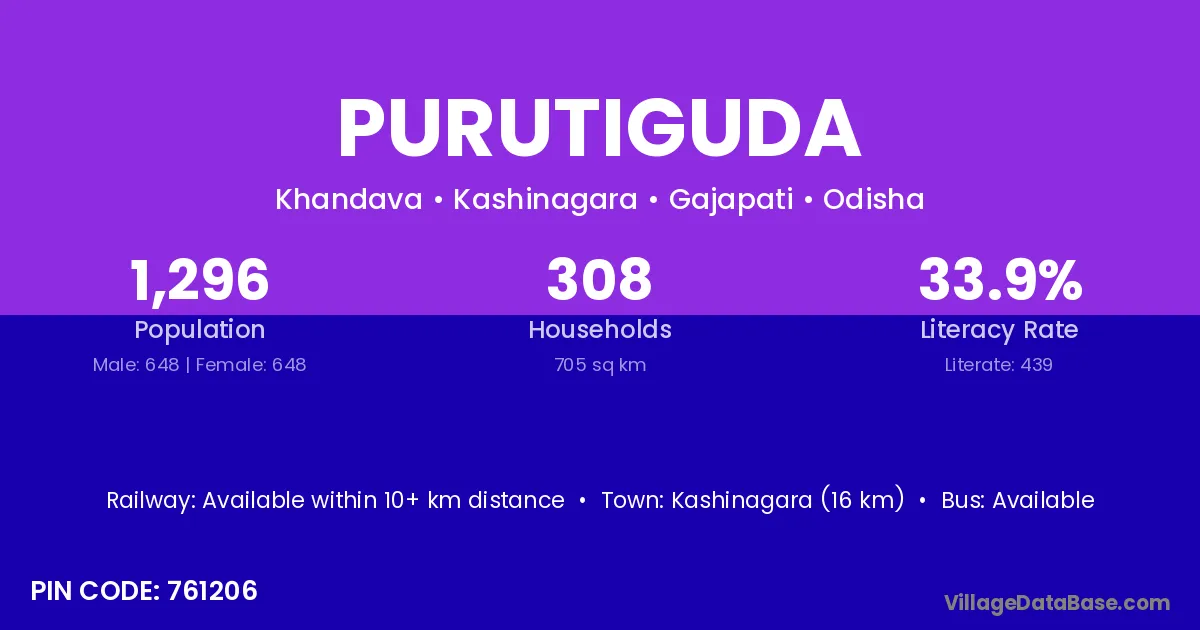 Rayagada (62 km) is the nearest town to Purutiguda village for major economic activities and is located approximately 62 km away.