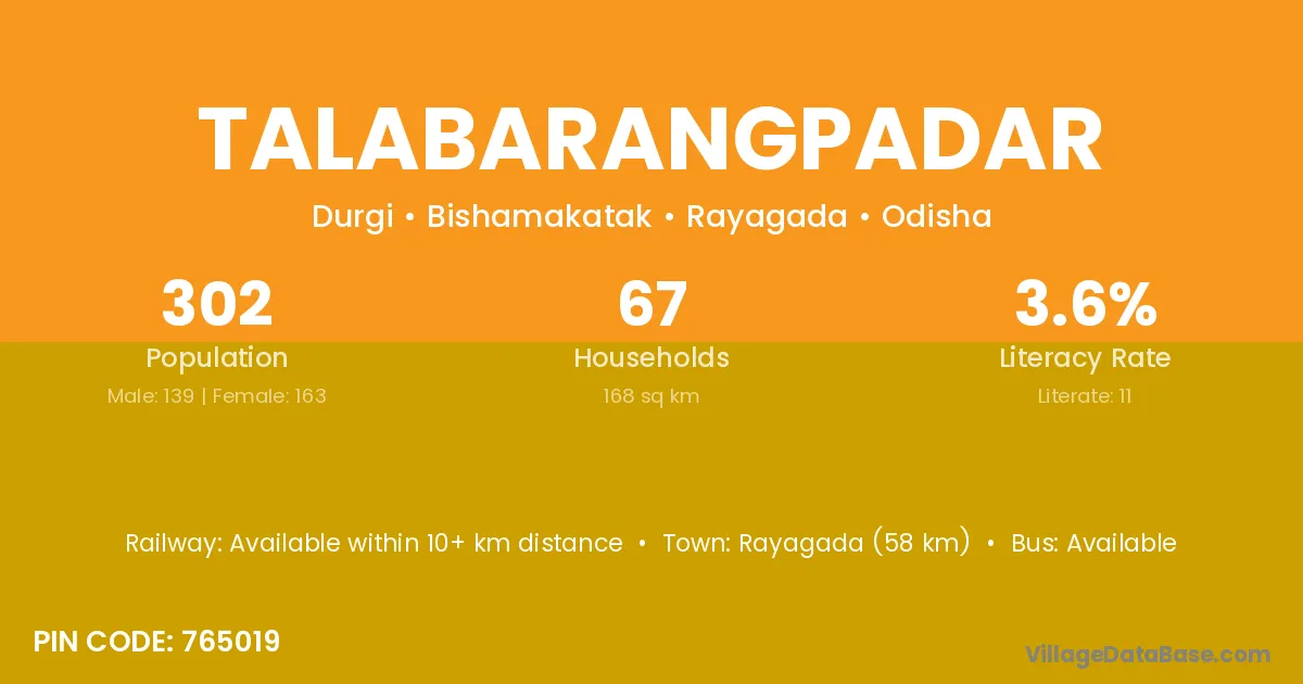 Rayagada (58 km) is the nearest town to Talabarangpadar village for major economic activities and is located approximately 58 km away.