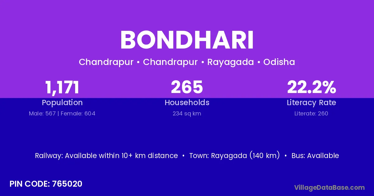 Bondhari village is located in the Chandrapur Tehsil of the Rayagada district in Odisha .