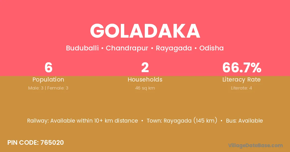Rayagada (145 km) is the nearest town to Goladaka village for major economic activities and is located approximately 145 km away.