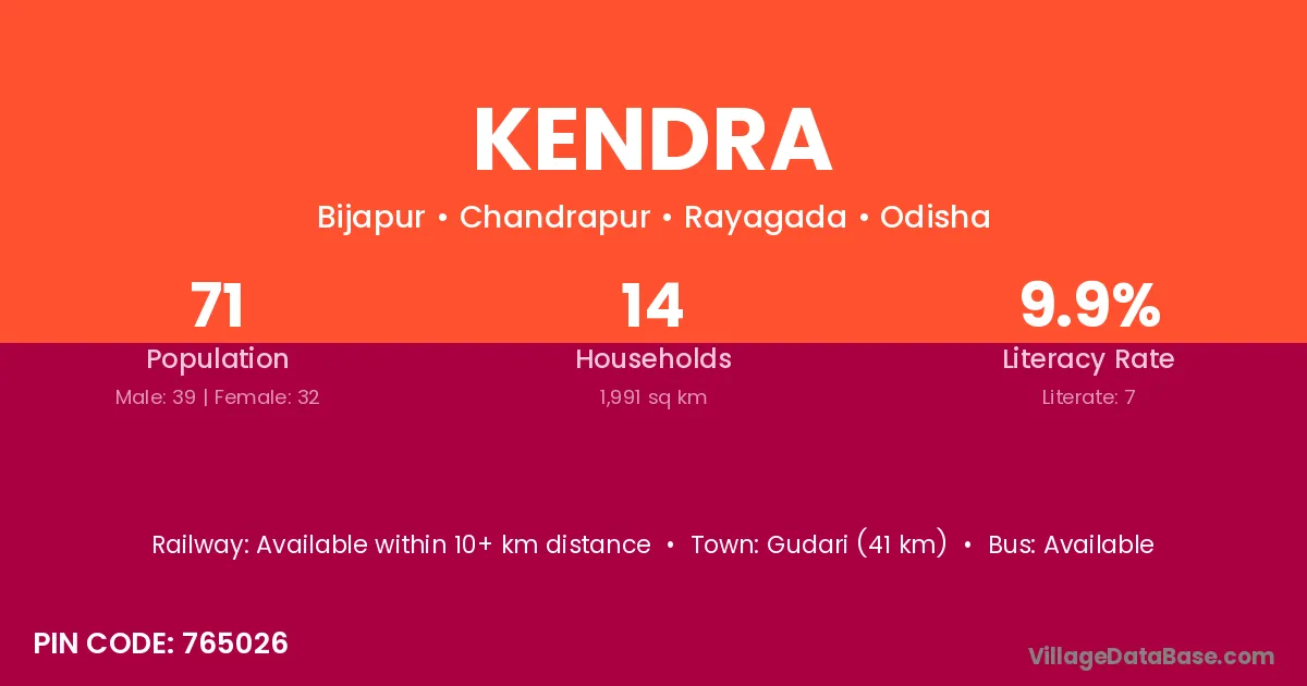 Gudari (41 km) is the nearest town to Kendra village for major economic activities and is located approximately 41 km away.