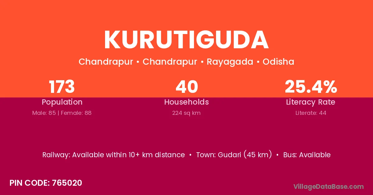 Kurutiguda village has a total population of 173 people, of which 85 are males and 88 are females.