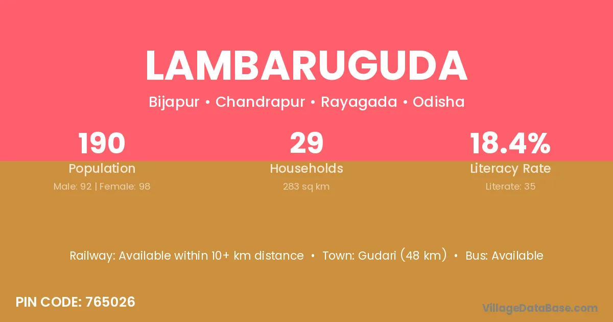 Lambaruguda village has a total population of 190 people, of which 92 are males and 98 are females.