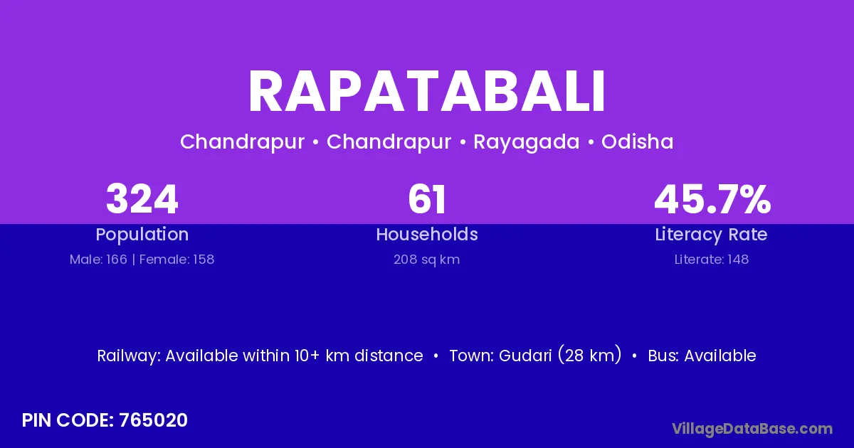 Gudari (28 km) is the nearest town to Rapatabali village for major economic activities and is located approximately 28 km away.