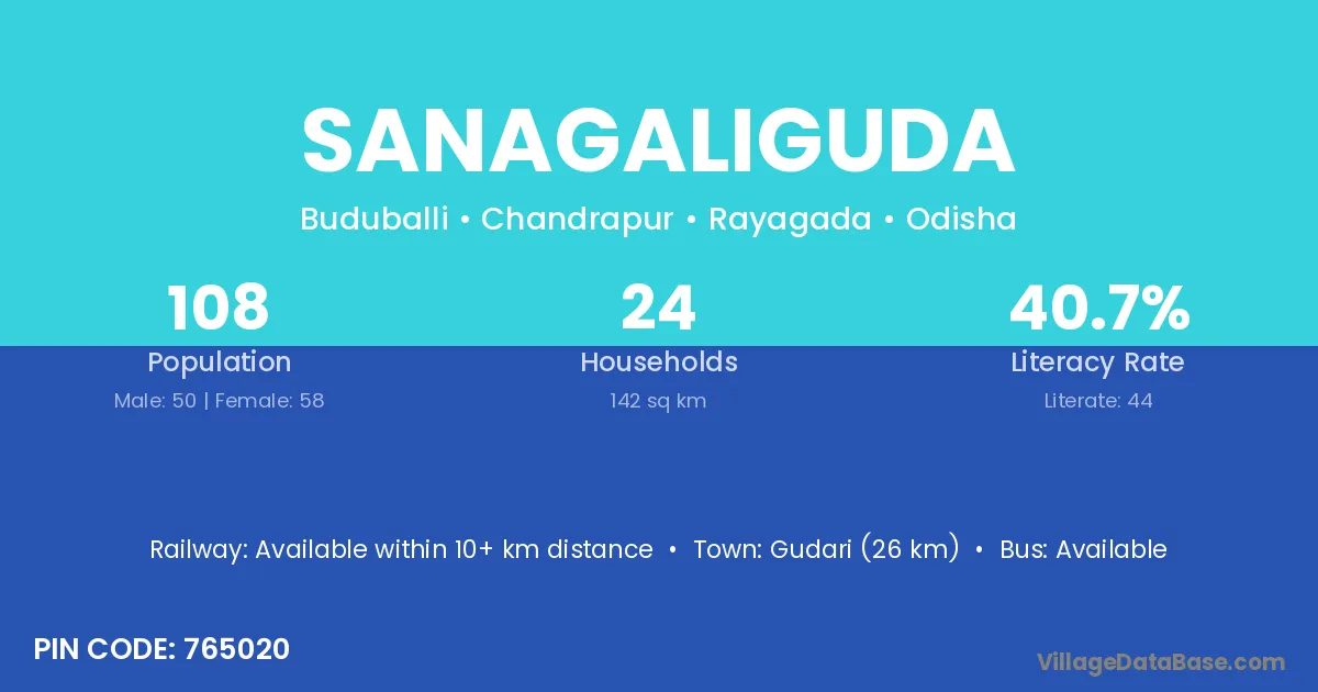 Gudari (26 km) is the nearest town to Sanagaliguda village for major economic activities and is located approximately 26 km away.