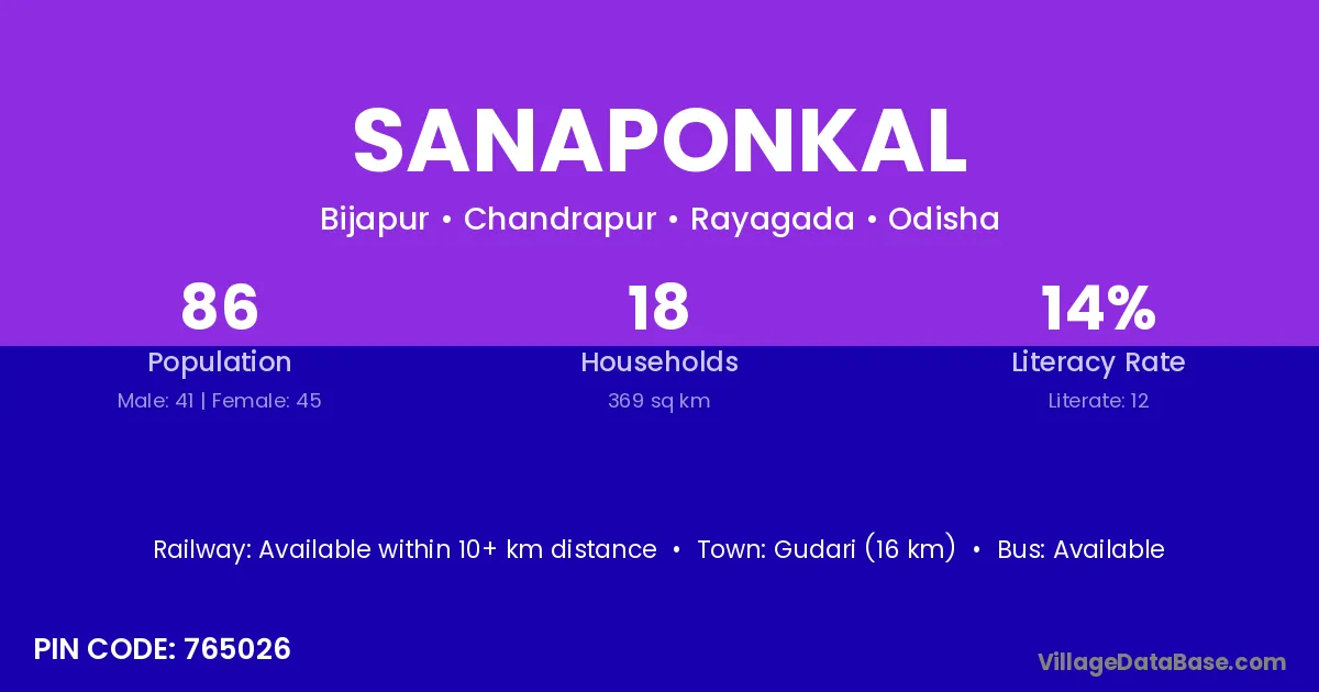 Gudari (16 km) is the nearest town to Sanaponkal village for major economic activities and is located approximately 16 km away.