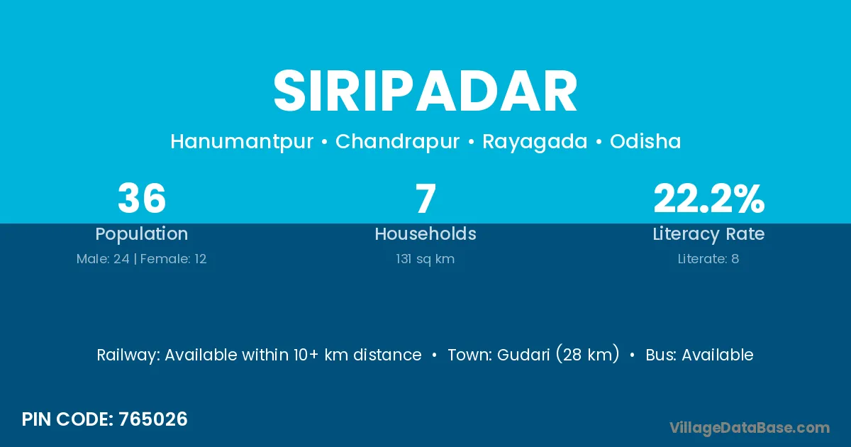 Gudari (28 km) is the nearest town to Siripadar village for major economic activities and is located approximately 28 km away.