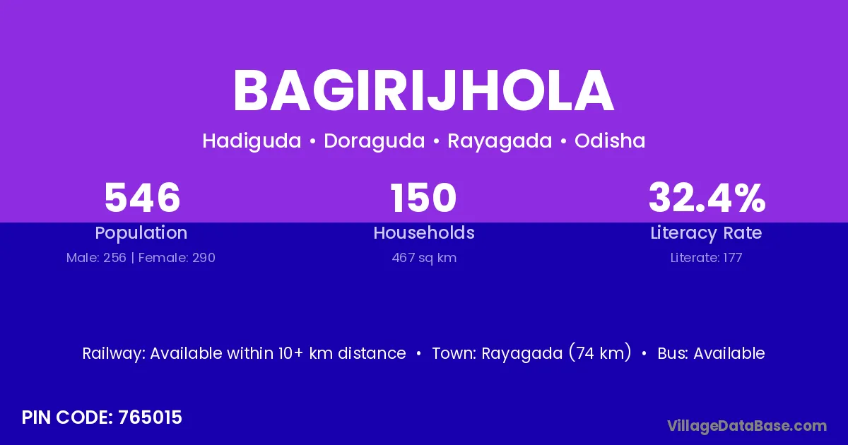 Rayagada (74 km) is the nearest town to Bagirijhola village for major economic activities and is located approximately 74 km away.
