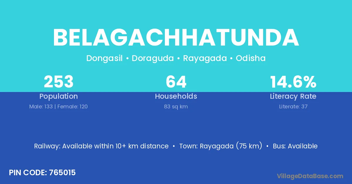 Rayagada (75 km) is the nearest town to Belagachhatunda village for major economic activities and is located approximately 75 km away.