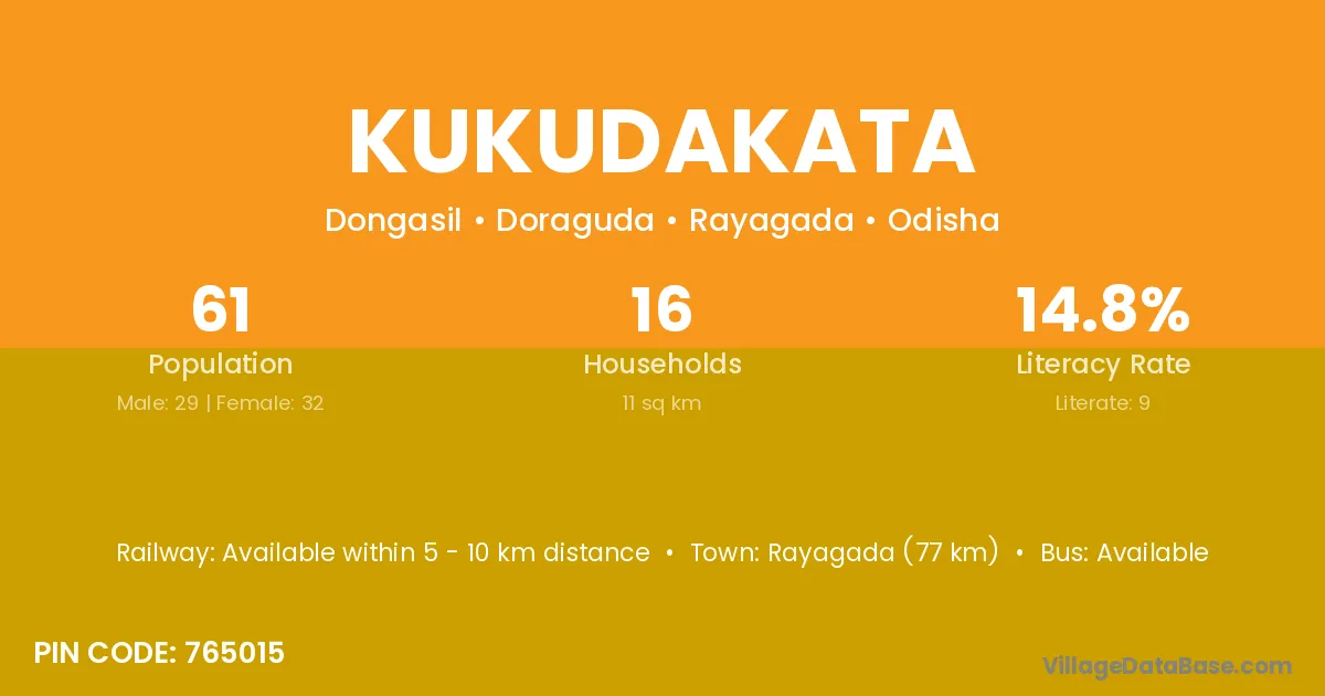 Kukudakata village has a total population of 61 people, of which 29 are males and 32 are females.