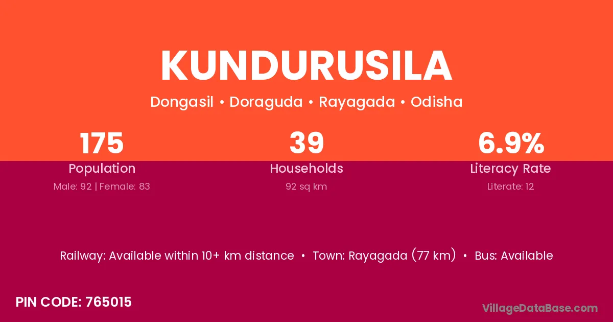 Kundurusila village has a total population of 175 people, of which 92 are males and 83 are females.