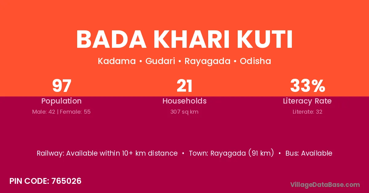 Rayagada (91 km) is the nearest town to Bada Khari Kuti village for major economic activities and is located approximately 91 km away.