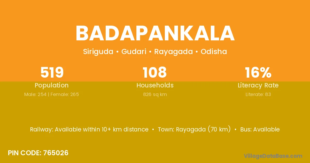 Rayagada (70 km) is the nearest town to Badapankala village for major economic activities and is located approximately 70 km away.