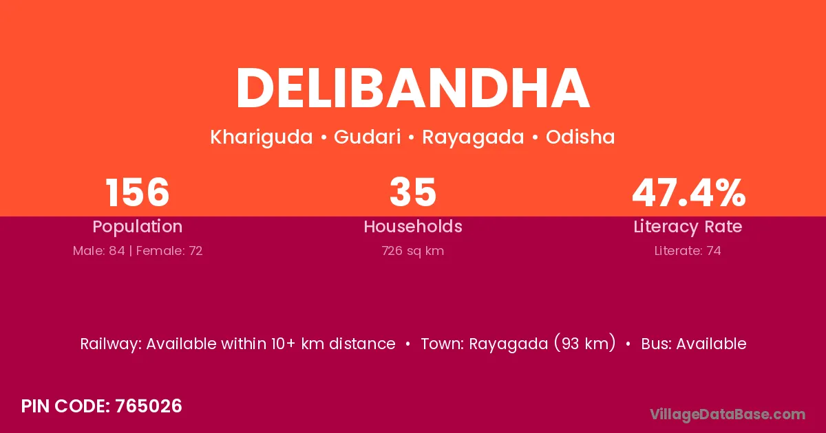 Rayagada (93 km) is the nearest town to Delibandha village for major economic activities and is located approximately 93 km away.