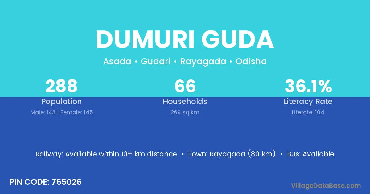Rayagada (80 km) is the nearest town to Dumuri Guda village for major economic activities and is located approximately 80 km away.