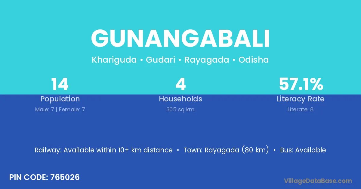 Rayagada (80 km) is the nearest town to Gunangabali village for major economic activities and is located approximately 80 km away.