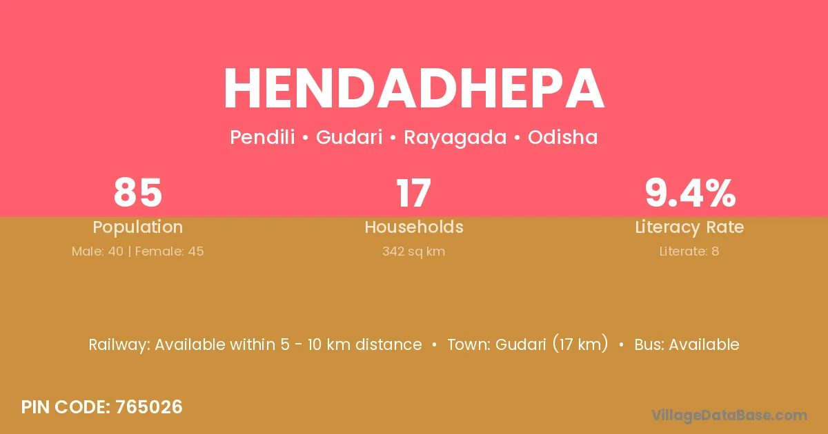 Gudari (17 km) is the nearest town to Hendadhepa village for major economic activities and is located approximately 17 km away.
