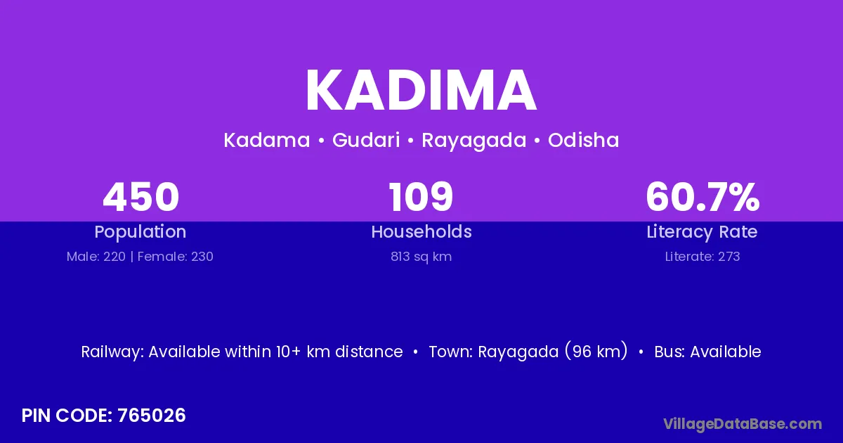 Rayagada (96 km) is the nearest town to Kadima village for major economic activities and is located approximately 96 km away.