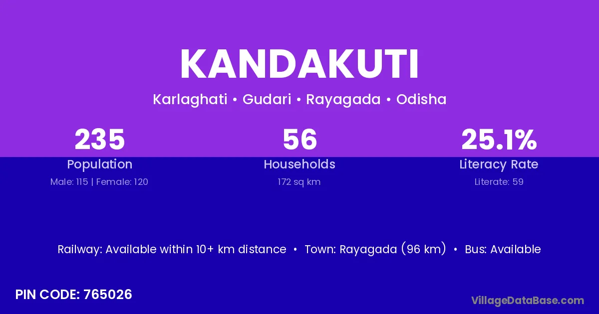 Rayagada (96 km) is the nearest town to Kandakuti village for major economic activities and is located approximately 96 km away.