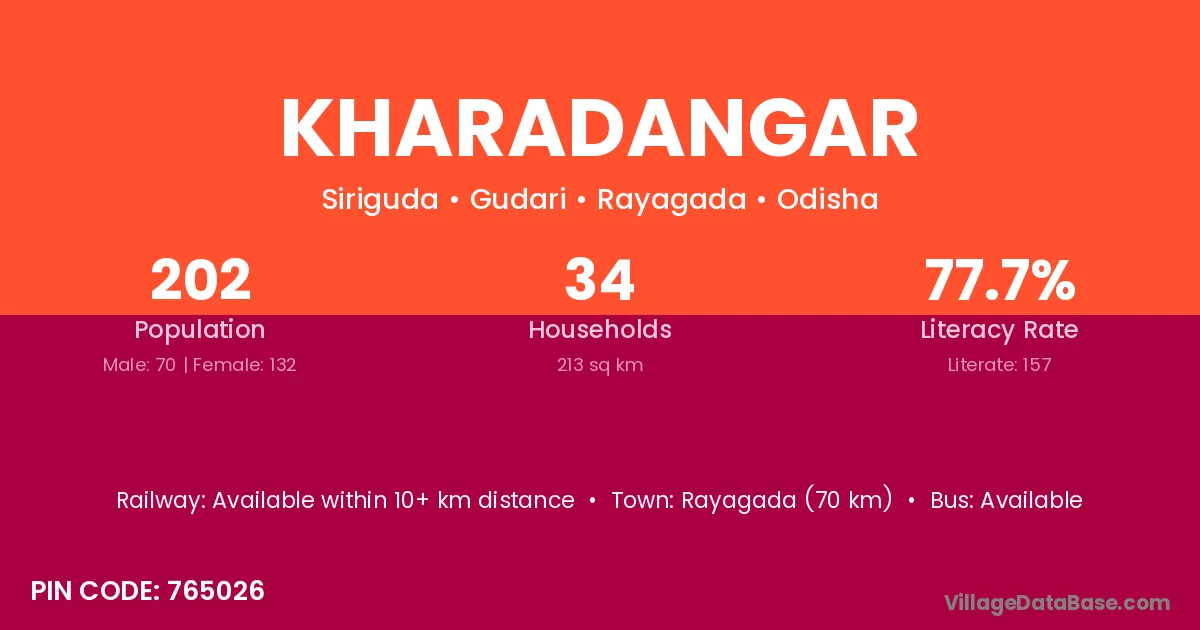 Rayagada (70 km) is the nearest town to Kharadangar village for major economic activities and is located approximately 70 km away.