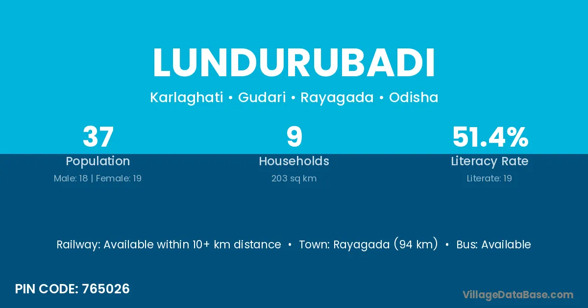 Rayagada (94 km) is the nearest town to Lundurubadi village for major economic activities and is located approximately 94 km away.