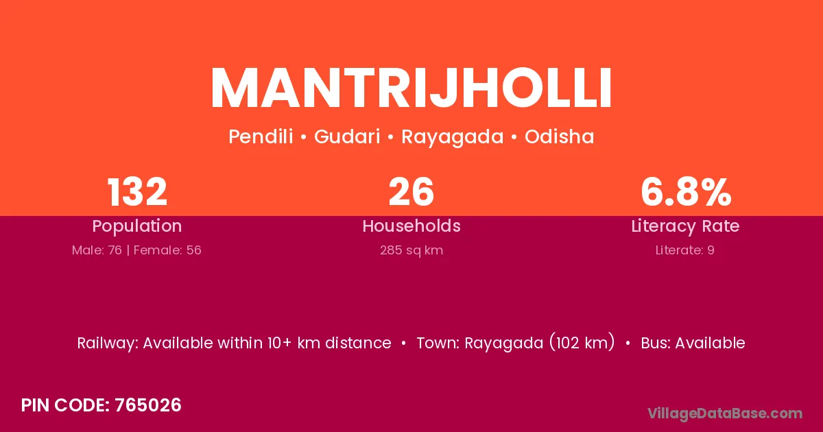 Rayagada (102 km) is the nearest town to Mantrijholli village for major economic activities and is located approximately 102 km away.