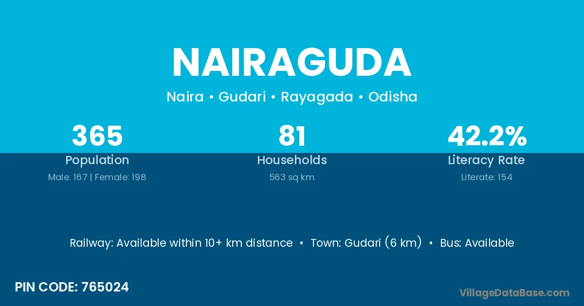 Gudari (6 km) is the nearest town to Nairaguda village for major economic activities and is located approximately 6 km away.