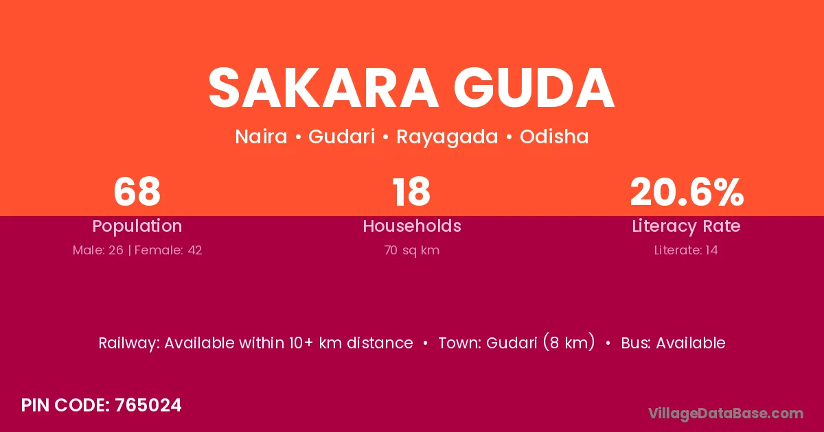 Gudari (8 km) is the nearest town to Sakara Guda village for major economic activities and is located approximately 8 km away.