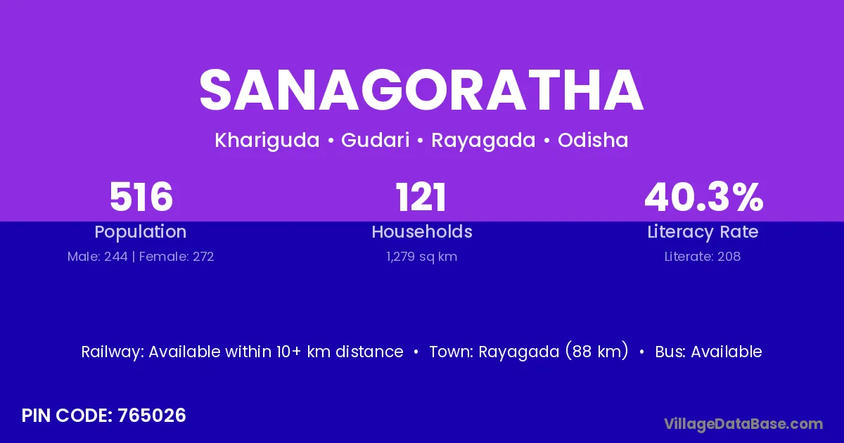 Rayagada (88 km) is the nearest town to Sanagoratha village for major economic activities and is located approximately 88 km away.