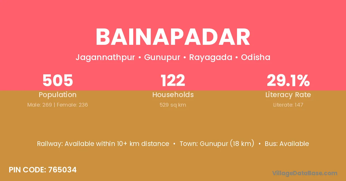 Gunupur (18 km) is the nearest town to Bainapadar village for major economic activities and is located approximately 18 km away.