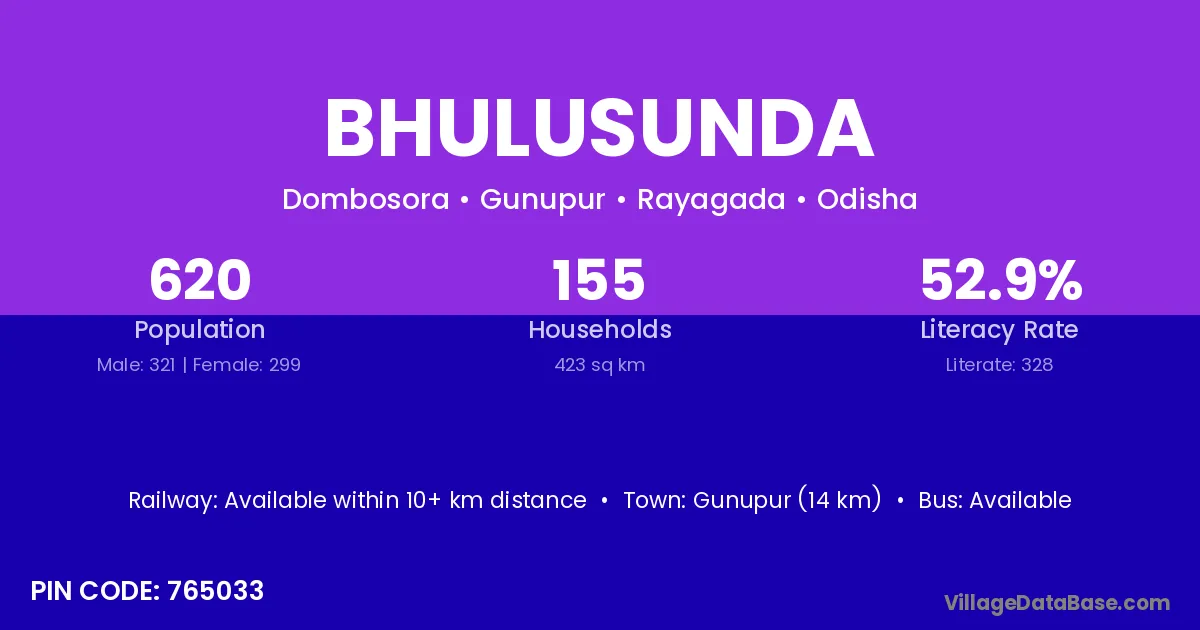 Gunupur (14 km) is the nearest town to Bhulusunda village for major economic activities and is located approximately 14 km away.