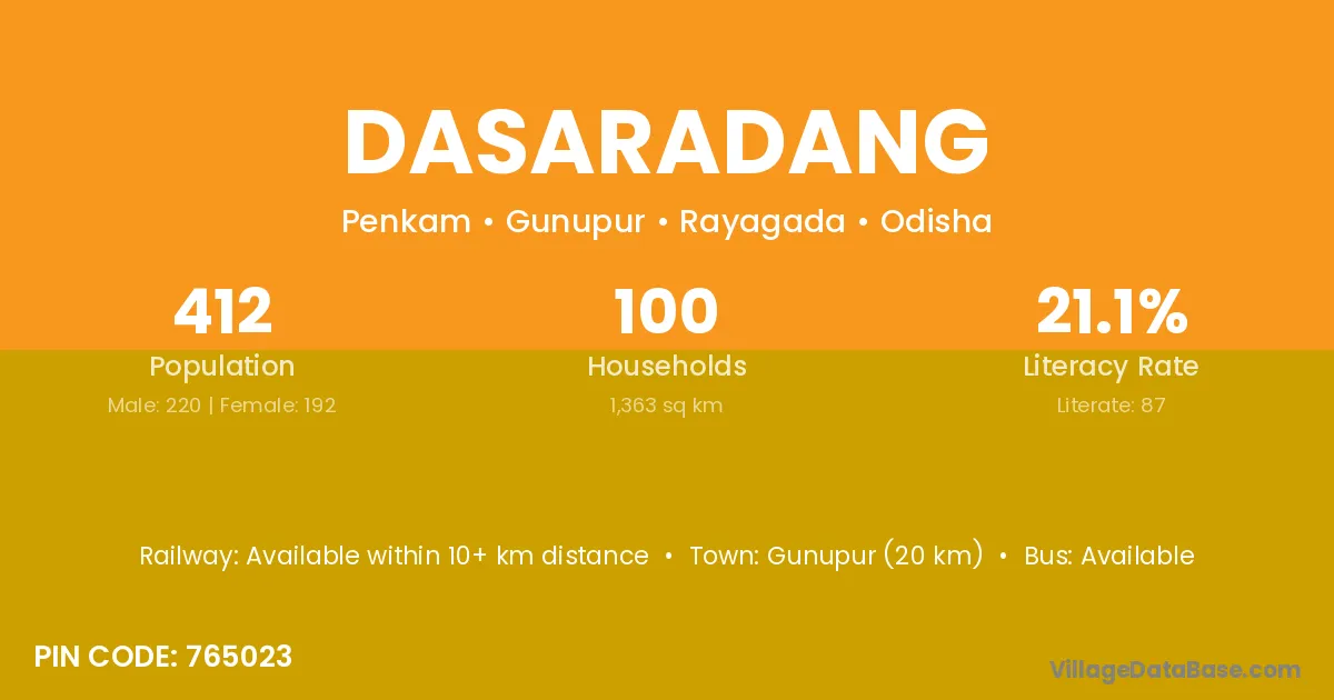 Gunupur (20 km) is the nearest town to Dasaradang village for major economic activities and is located approximately 20 km away.