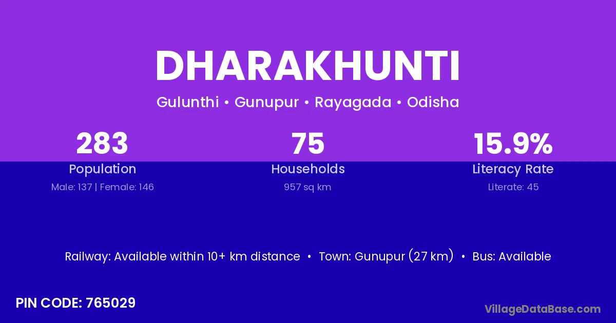 Gunupur (27 km) is the nearest town to Dharakhunti village for major economic activities and is located approximately 27 km away.