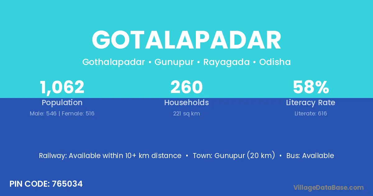 Gunupur (20 km) is the nearest town to Gotalapadar village for major economic activities and is located approximately 20 km away.