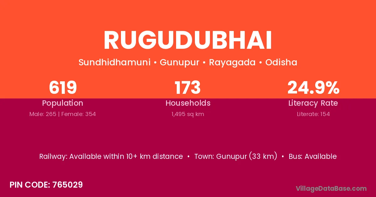 Gunupur (33 km) is the nearest town to Rugudubhai village for major economic activities and is located approximately 33 km away.