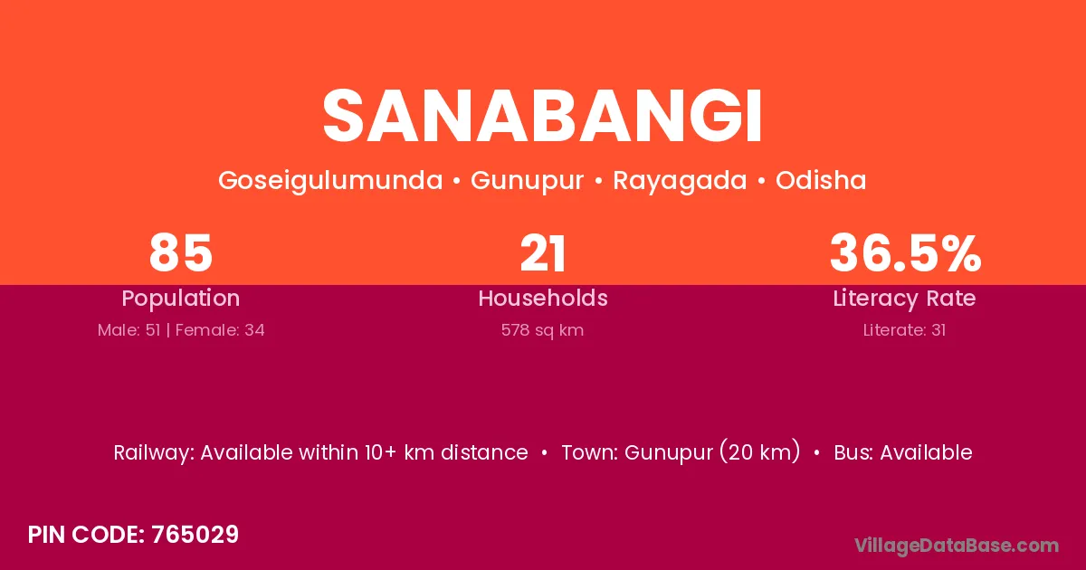 Gunupur (20 km) is the nearest town to Sanabangi village for major economic activities and is located approximately 20 km away.
