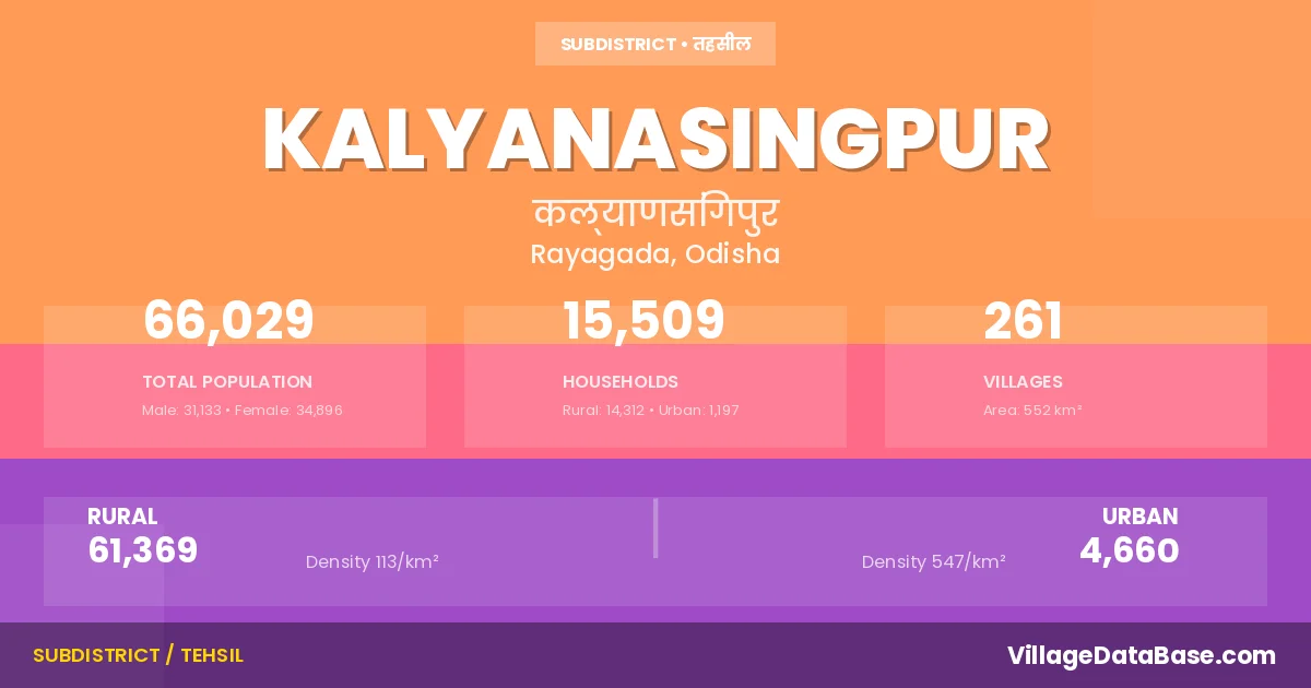 Kalyanasingpur is a town and Tehsil in the Rayagada district of the Odisha. In India, a Tehsil is a subdivision of a district responsible for the administration and revenue collection of a specific area within the district. Tehsils play a crucial role in the local governance structure, contributing significantly to the development and administration of their communities.