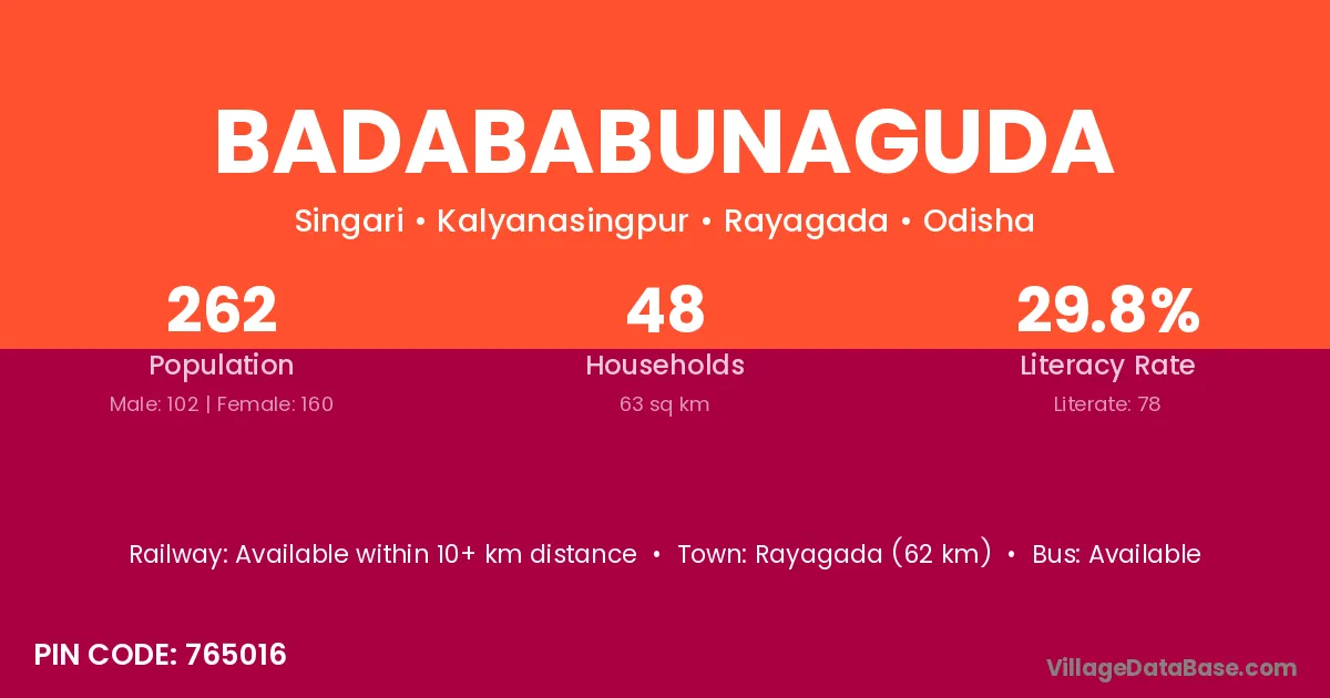 Rayagada (62 km) is the nearest town to Badababunaguda village for major economic activities and is located approximately 62 km away.