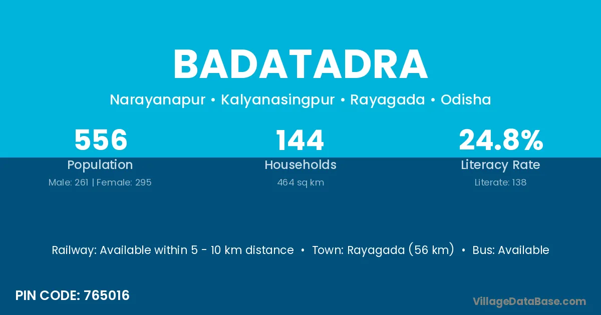 Rayagada (56 km) is the nearest town to Badatadra village for major economic activities and is located approximately 56 km away.